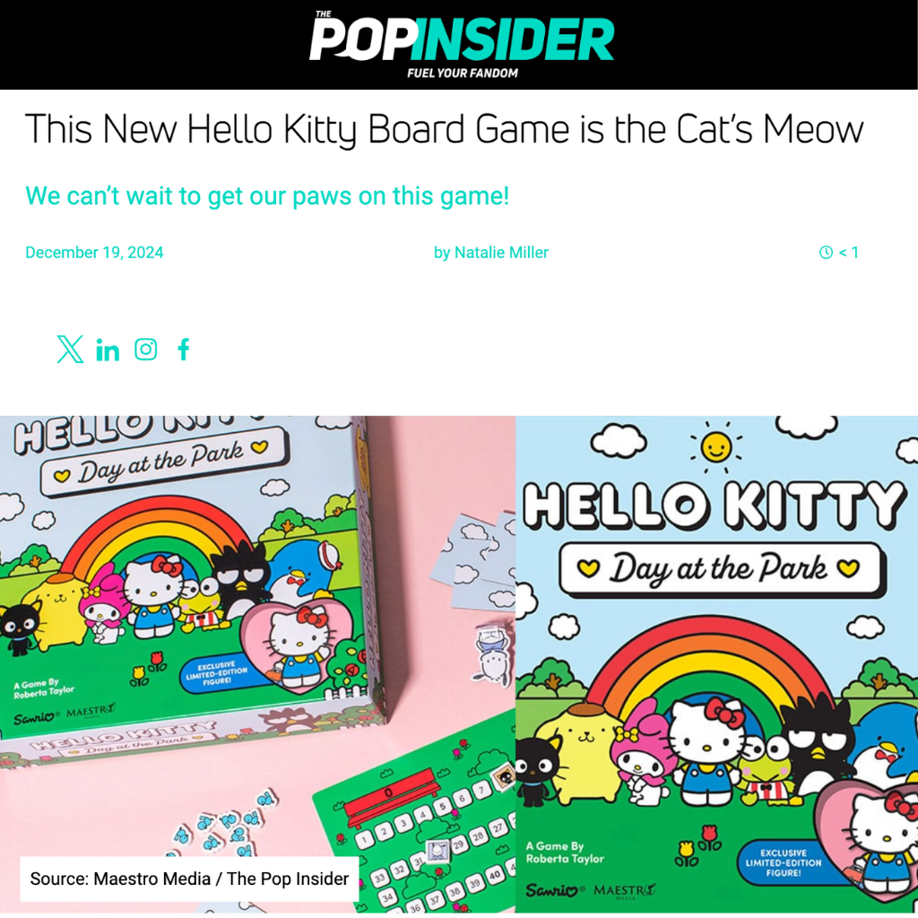 Following the success of Maestro Media’s video game adaptations, the next major project marked an exciting evolution for the company: partnering with one of the world’s most recognizable lifestyle brands, Sanrio. Hello Kitty: Day at the Park transformed the global icon into a charming tabletop game for families and fans of all ages, inviting players eight and up into a bright, joyful experience that celebrated friendship, kindness, and play.