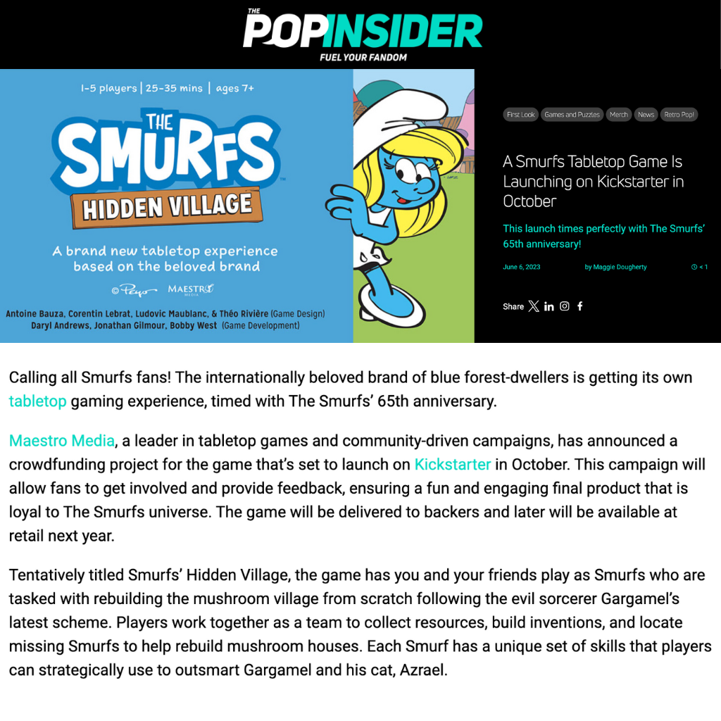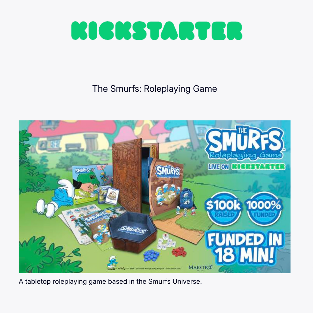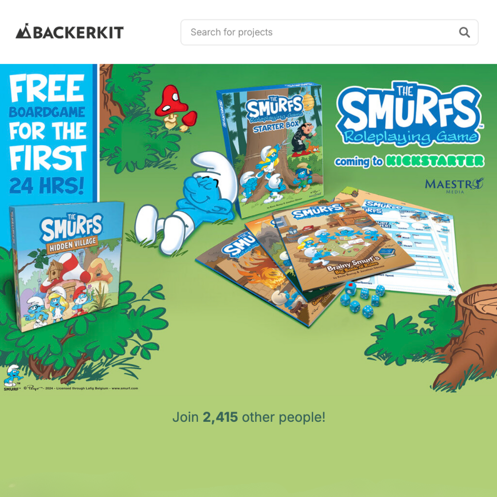 Building on the success of Hidden Village, Maestro Media expanded its work with Peyo to create The Smurfs Roleplay Game, designed by Kevin Borrup. This project marked the company’s first-ever venture into the roleplaying genre—a departure from traditional board games and an exciting opportunity to explore a more narrative-driven experience. For this launch, we returned to Kickstarter, leveraging the platform’s ability to bring together niche and passionate gaming communities. The campaign introduced stretch goals and unlockable content to engage players and educate them about the roleplaying format.